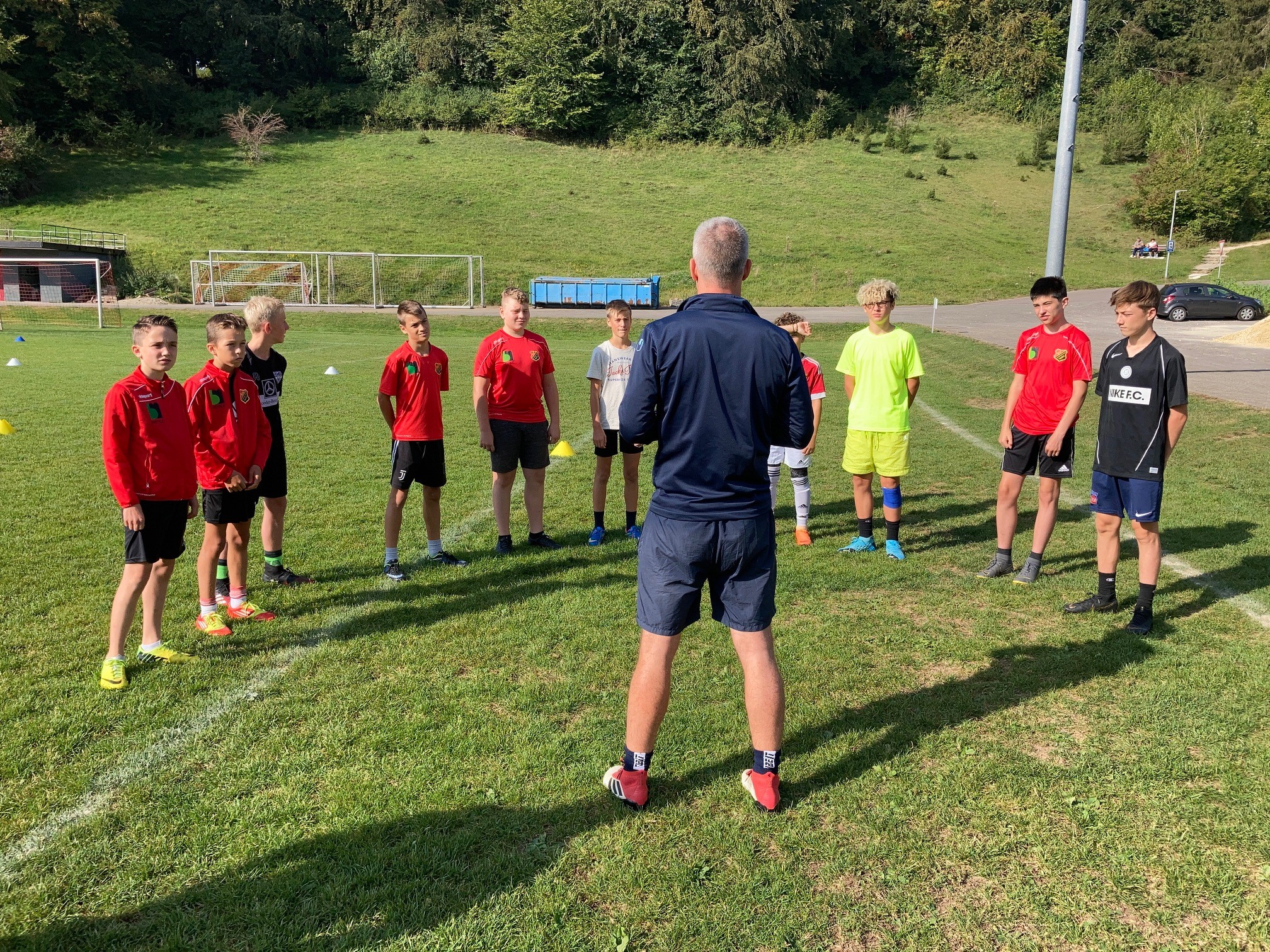 [Howie] Am Sonntag 20. September war Michael Maguhn von der Münchner Fussballschule zu Gast beim SVW. Insgesamt 14 Jugendtrainer, von den Bambinis bis zur A-Jugend, erlebten bei herrlichen Temperaturen einen interessanten Tag auf dem Sportgelände des SV Westerheim. Gestartet wurde mit einem kleinen Theorie Teil. Dabei lernten die Trainer, dass das klassische Dehnen nicht mehr empfohlen wird und man stattdessen eher auf Aufwärmspiele und Lockerungsgymnastik setzen sollte. Auch die klassischen Waldläufe sind nicht mehr angesagt.