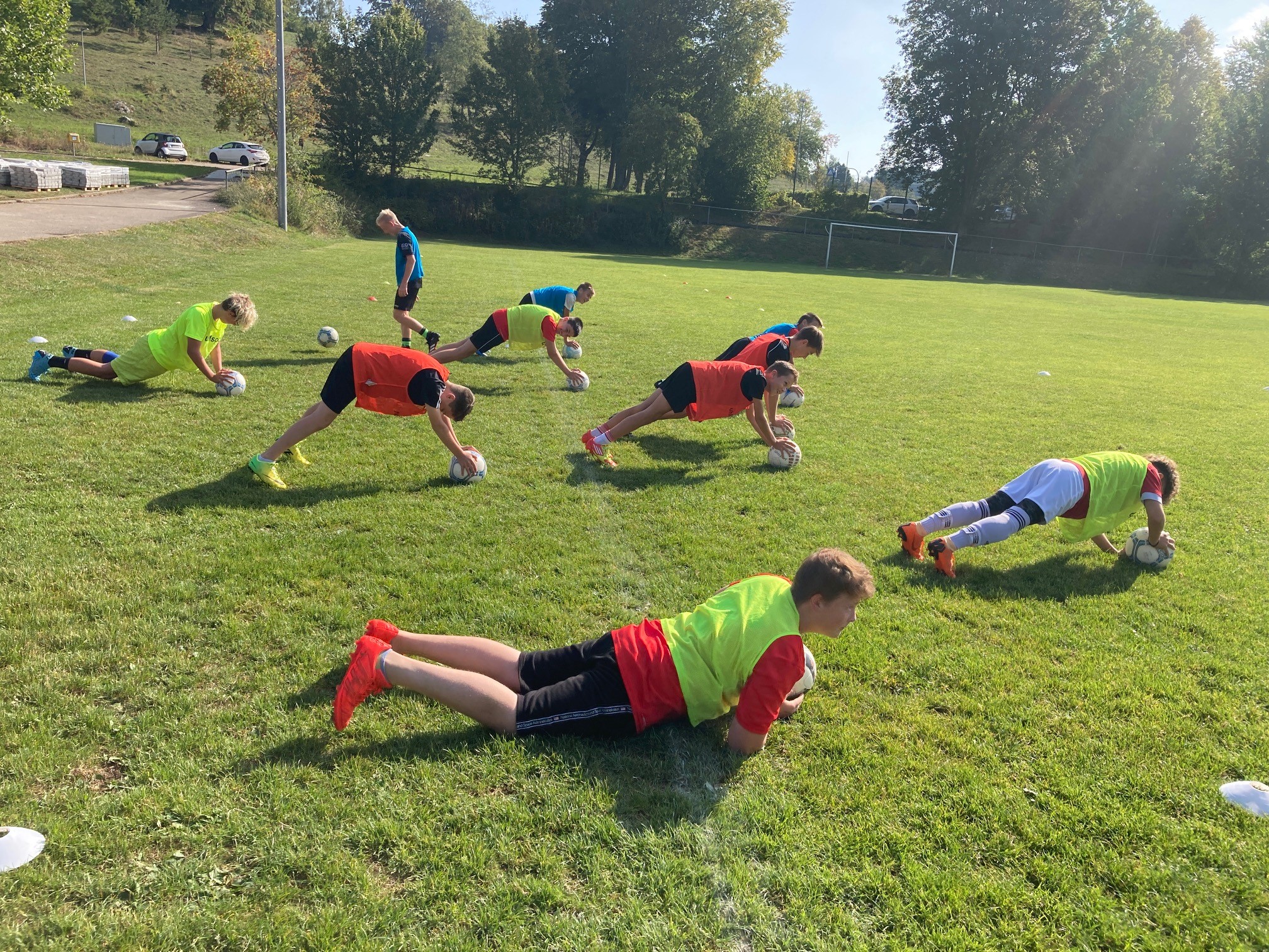 Nachmittags wurde das Training mit unserer A-Jugend gemacht. Auch für die in der Landesstaffel spielenden war die Annahme eines hohen Balles mit dem Bauchnabel etwas Neues.