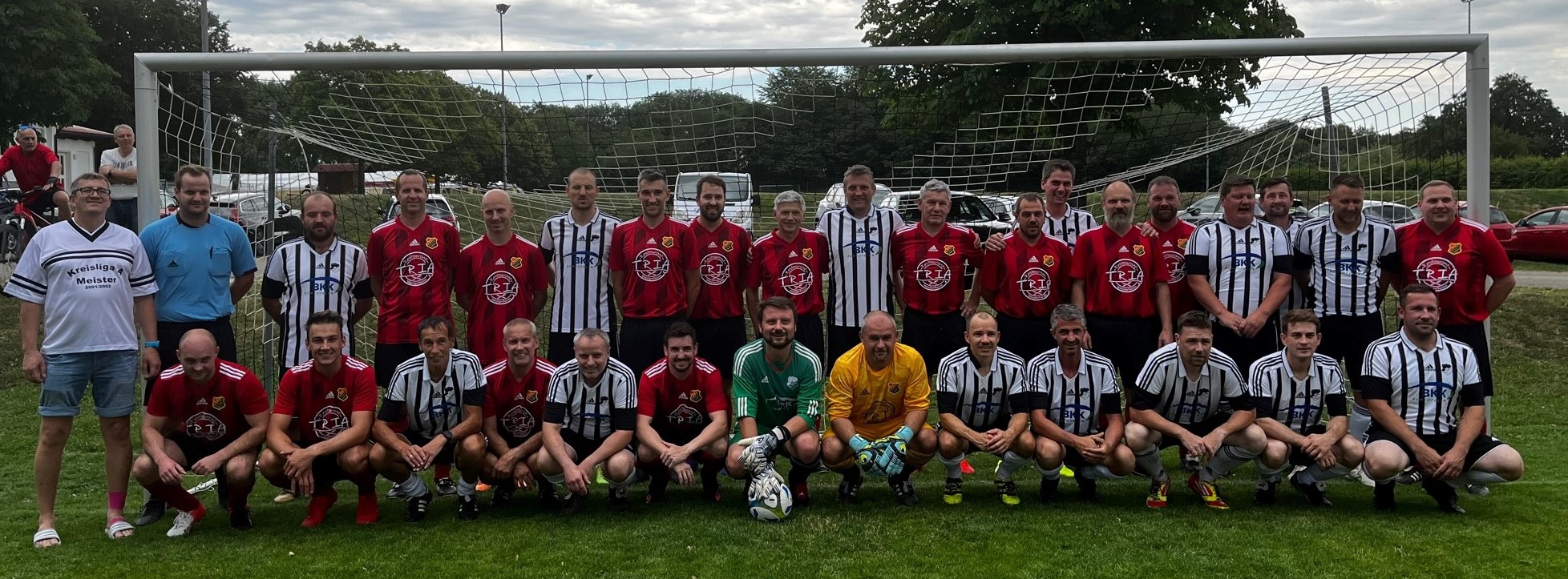 Danach gab es einen heftigen Regenschauer und die Spieler waren klatschnass. Noch vor der Halbzeitpause knallte die Sonne wieder auf den Platz. Rudi Maier spielte nach der Halbzeitpause auch mit, es war sein (vermutlich) letztes Spiel in der AH.