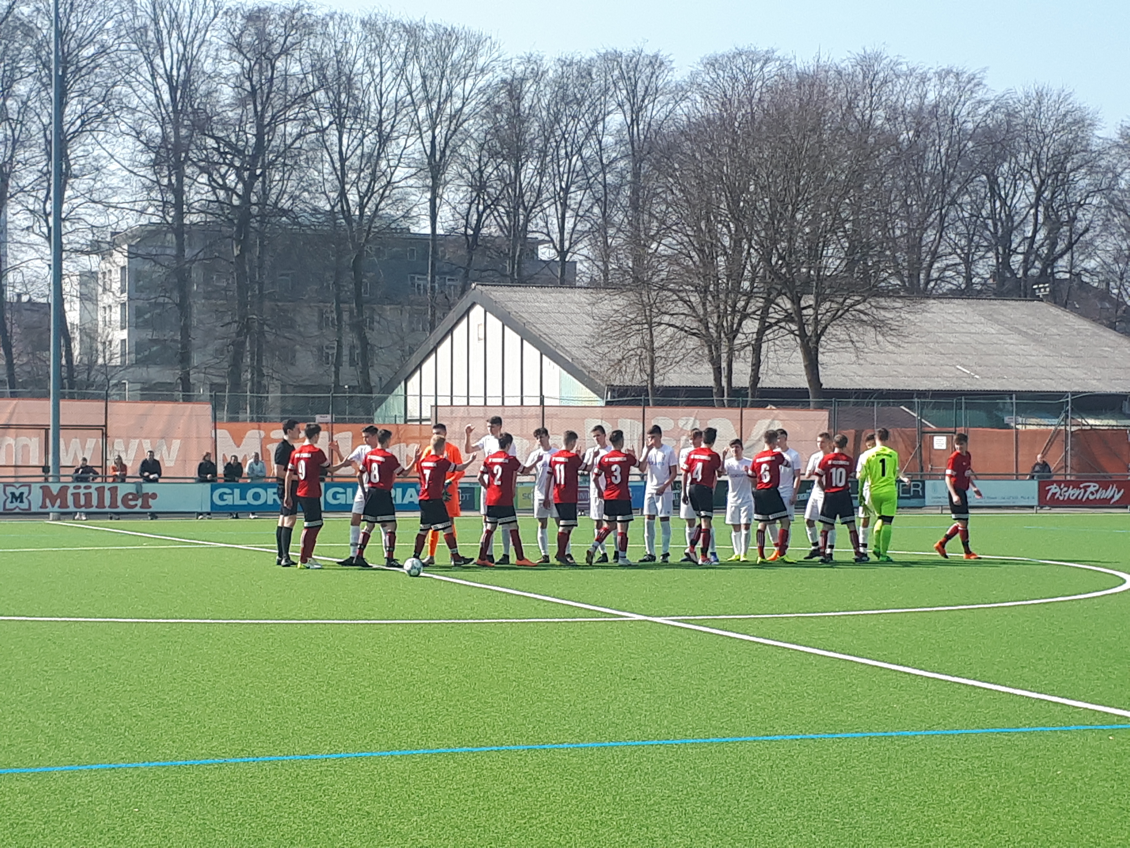 Schönstes Fußballwetter an der Ulmer Donau am Sonntag, 24.03.2019. Die B-Junioren des SV Westerheim waren zu Gast beim SSV Ulm 1846 Fußball II. Das Team aus Westerheim hat sich einiges vorgenommen und wollten auf jeden Fall Punkte mit nach Hause bringen. Die aktuelle Lage beim SSV1846 nicht optimal. Sie rutschten auf einen Abstiegsplatz, da der FC Wangen am Tag zuvor gegen den VfB Friedrichshafen deutlich gewonnen hat. Um kurz nach 11.00 Uhr wurde die Partie angepfiffen. Die Ulmer legten gleich aggressiv los und setzten die Gäste gekonnt unter Druck. Der SVW zu sehr beeindruckt, stand zu weit weg von den Gegenspielern und nicht konsequent genug im Zweikampf. Leon Agaj vom Heimteam sollte seinen großen Tag haben und bescherte den Spatzen mit einer überragenden Leistung durch einen lupenreinen Hattrick eine 3:0 (6./27./30.) Führung nach 30 Minuten. Was ging nun in den Köpfen der SVWler vor ? Mit der Einwechslung von Sebastian Göser bekamen die Jungs von der Alb wieder etwas mehr Sicherheit ins Spiel. In der 32. Minute ein Eckball für den SVW konnte Sebastian zum 3:1 per Kopf versenken. Der SVW kam wieder besser ins Spiel. Fünf Minuten später setzte sich Hannes Walter auf der linken Seite gekonnt durch drei Ulmer durch und brachte die Flanke schön vor das Tor wo Tim Rauschmaier ebenfalls per Kopf zum 2:3 Anschlusstreffer einnetzte (37.). Der SV Westerheim war wieder im Spiel. Mit diesem Spielstand ging es in die Pause.