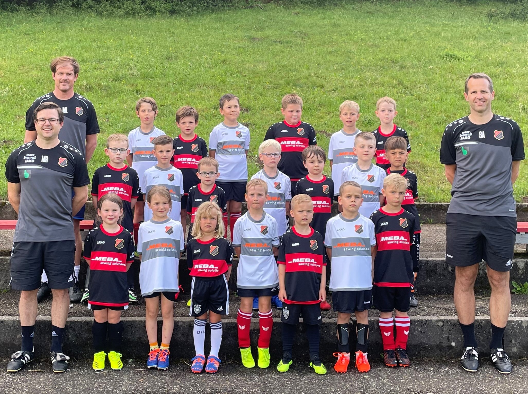 [Howie] Die 20 Bambini Fußballer des SVW haben am Donnerstag 24. Juni ihren Saisonabschluss gefeiert. Aufgrund der Corona Pandemie konnte in der kompletten Saison kein einziges Turnier gespielt werden, weshalb die von der Firma MEBA Metall-Bandsägemaschinen GmbH gesponserten Trikots bisher noch nicht zum Einsatz gekommen sind. Daher streiften sich die kleinsten SVW Fußballer für das letzte Training der Saison das neue Trikot über.