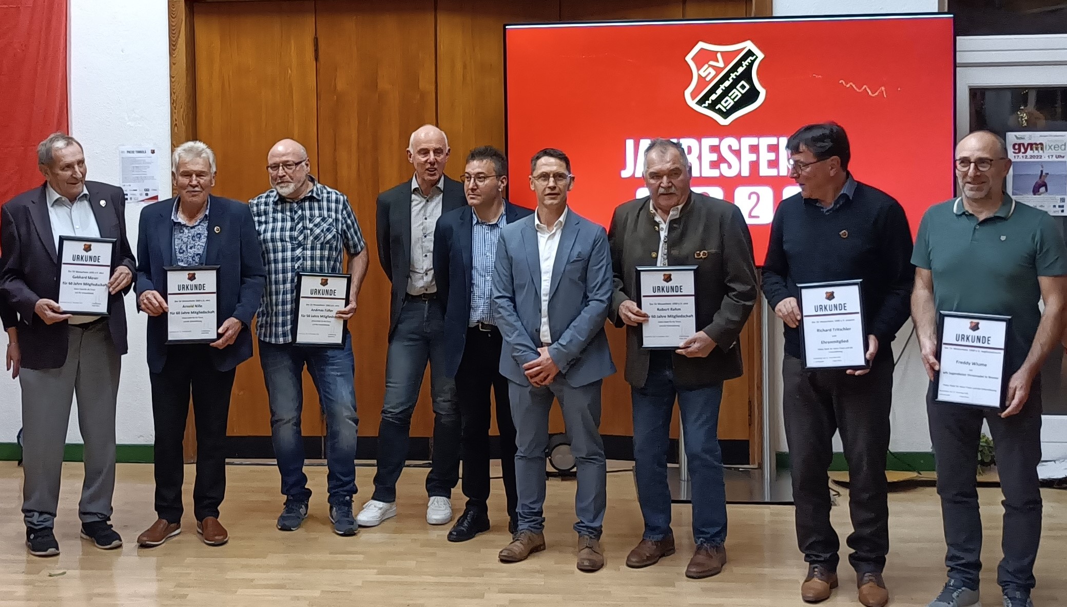 Auch in diesem Jahr gab es wieder Jubilare und so ehrte der Vorstand Mitglieder für 50 und 60 Jahre Vereinsmitgliedschaft. Für 50 Jahre wurde Wolfram Maier geehrt. In seiner langem SVW Karriere war er unter anderem mitverantwortlich für den Aufstieg in die Bezirksliga im Jahr 1981. Ebenso für 50 Jahre wurde Andreas Füller geehrt. Während seine Karriere als Fußballspieler kurz war, machte er sich als Jugendtrainer einen Namen unter anderem mit dem Aufstieg der B-Junioren in die Bezirksstaffel. Noch heute unterstützt er als Platzkassierer und Ordner die Fußballer.