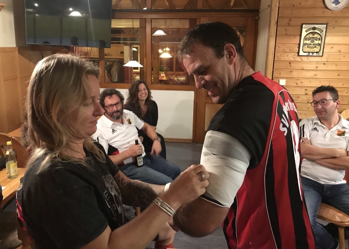 Andrea mit Erstversorgung bei Kädder. Hat gut funktioniert, im nächsten Spiel hat er gleich das Siegtor geschossen