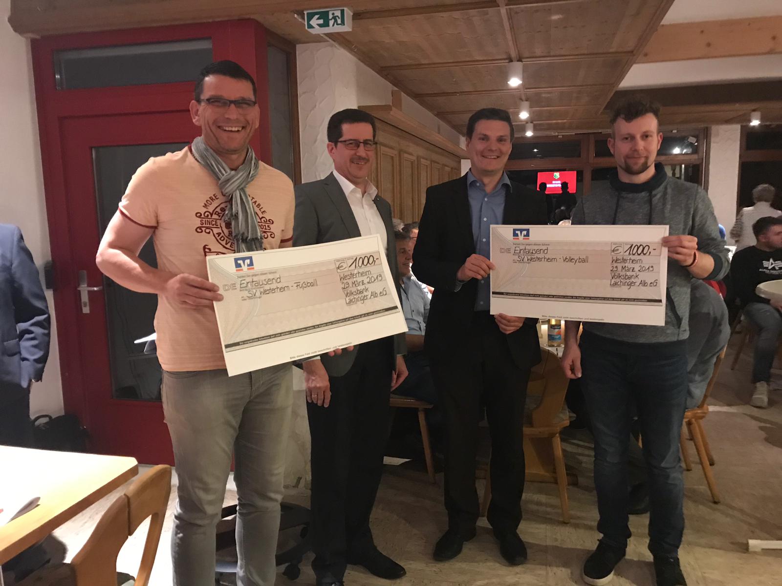 Erfreulicherweise erhielt der SV Westerheim im letzten Jahr gleich zwei größere Spenden von der Volksbank Laichingen. Dazu waren Herr Schiffbauer und Herr Gantenbein anwesend. Diese übergaben einen Scheck in Höhe von 1.000 € an Jochen Doll als Vertreter der Fußballabteilung. Dieser ist für die Sanierung des Hauptspielfeldes bestimmt. Ebenso übergab er für die Beschaffung von zwölf Bällen und zwei Netzen für die Volleyballabteilung einen Scheck in Höhe von 1.000 € an den neuen Abteilungsleiter Dominik Dolejsi. Diese Spenden sorgen nicht nur für etwas Entspannung für unseren Hauptkassierer Merten Schäfer, sondern auch für viel Freude bei den Jugendlichen im Volleyball, für welche nun genügend Bälle zum Trainieren vorhanden sind.