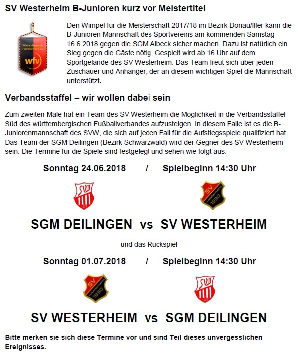 Im nun letzten Punktspiel am Samstag, 16.06.2018 um 16.00 Uhr gegen die SGM Albeck (Heimspiel) können die Jungs des Sportvereins ihren zweiten Titel (Meister) in dieser Saison sicher machen.